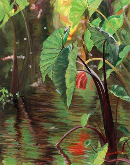 In Red Taro, I was interested in the play between the plants so important to the Hawaiian culture, the water in which they grow, and the jewel-like raindrops, which make all possible.