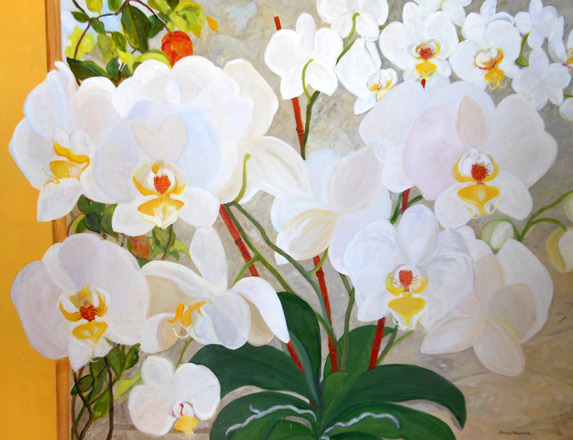 I love to paint orchids, and especially love to place them in an interesting composition. This orchid is placed in front of a window with a vine and pavers in the courtyard on the other side. 30x40 Oil on canvas, gallery wrap