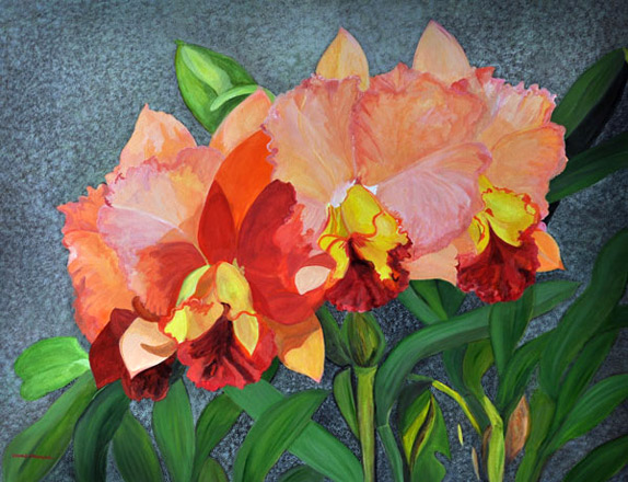Cattleyas attract attention with their large showy flowers. For this piece I deliberately chose a mottled neutral color for the background so the vivid blooms would really stand out.. 30x40 Oil on canvas
