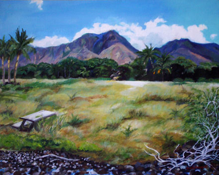 This painting was commissioned as a client gift to celebrate the sale of a beautiful, ocean front vacant lot.  The challenging part was creating a focus for the painting.  I used one of the client's favorite views as the subject and included elements which capture the feel of the site in its natural state.
