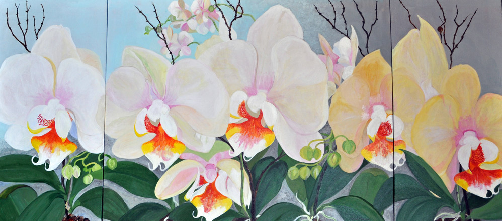 I was intrigued by these sensual moth orchids and imagined them dancing to classical music when I'm not looking. 24x12, 24x30, 24x12 Oil on canvas