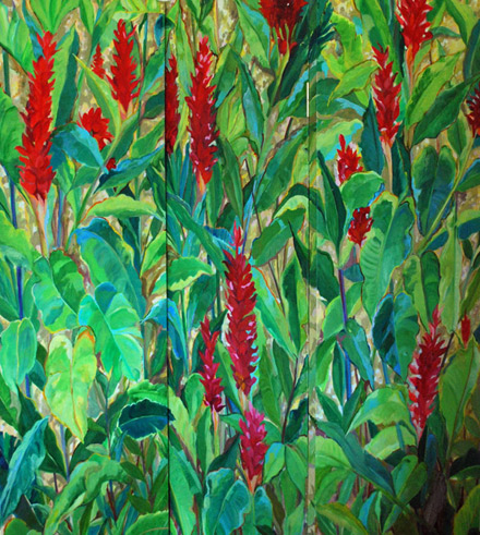 I wanted to paint a screen using red ginger as the motif. I find ginger especially appealing when it is back lit, and I also used gold paint for part of the back ground, echoing the use of gold leaf in Japanese screens.
